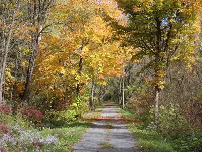 In forested areas, the trail provides sunlit edges to the otherwise shaded forest floor. These edges permit the growth of sun-tolerant vegetation such as wild apple trees, berry bushes and grass, thereby enhancing the forage possibilities for numerous animal species. The observant trail user will encounter: a variety of birds including herons, ospreys and turkeys; several varieties of turtle including the snapping turtle; several species of snake including the endangered black rat snake; and numerous mammals such as mice, chipmunks, squirrels, rabbits, otters, foxes, coyotes, and deer.